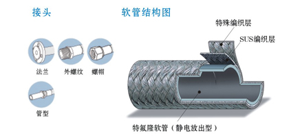 (静电放出型:导电型) 适用于超高压场合(以产生静电为前提)使用最高品质的特氟隆PTFE,内壁添加了15%的碳,外包使用特殊编带加强保护,具有优越的耐久性能。 特长: 1、 面向超高压场合而设计 2、 防止静电危害 3、 最适合用于高粘度物质的传送 4、 高于SAE100R8及SAE100R9规格的可弯曲性、耐药品性、耐湿性,热膨胀率低 5、 使用特殊编织层,是耐压性、安全性极高的产品。 使用温度范围: 连续-54-200℃ *根据接头金具、外包装材、使用温度等因素不同,软管的常用压力会有所不同。详情请垂询本公司。 用途: 1、 油压配管; 2、 空压机器; 3、 粘结剂等高粘度流体的配管。 材质: 1、PTFE; 2、加强材:特殊编织层。 |