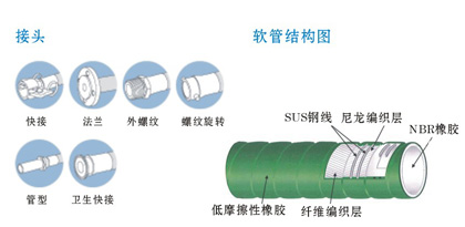 软管内表面采用FDA标准的NBR白橡胶,具有优越耐油性·耐磨性,中间层采用尼龙纤维编织层和SUS钢线加强,可用于负压场合 特长: 1、 适用于耐油等油脂成分多、粘度高的流体 2、 外部采用绿色、宽波型、低摩擦性的橡胶具有良好的耐油性、耐摩擦性,我i阿布容易清洗 使用温度范围: 连续-25-80℃ *根据接头金具、外包装材、使用温度等因素不同,软管的常用压力会有所不同。详情请垂询本公司 用途: 1、 填充线 2、 清洗机 3、 CIP清洗 4、 SIP清洗 5、 各种食品、液糖 6、 输料 适用规格: FDA 材质: 1 液体接触部:白色NBR橡胶 2、中间加强材:尼龙纤维编织层SUS钢丝二层 3、外包装材:低摩擦性橡胶 |